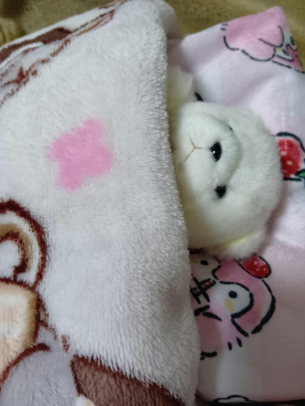 帽子を被るクマちゃん、ベットでお布団を被りスヤスヤと眠るクマちゃんのお写真を拝見し、すごく心がほんわかと温まりました。